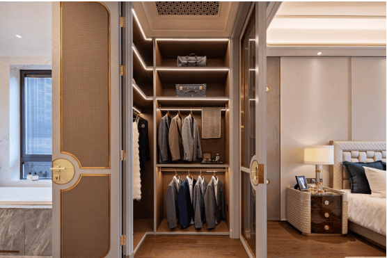 独立衣帽间采用扪皮+橡木板,超大空间满足男女主人放置衣物饰品的需求;