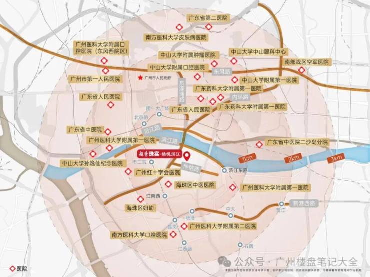 享受广医一院、二院,珠江医院,海珠区妇幼,广州市十字会医院等号称“五分钟生命线”的老城医疗保障。同时3km范围可速达海珠、越秀多个重点医疗配套。