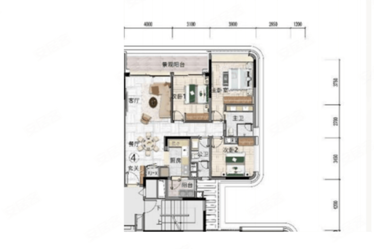 190㎡的四房两厅三卫户型,采用客餐厅一体化设计,各房间空间均衡,满足二胎家庭或三代同住需求;