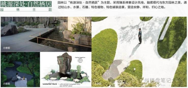 以“桃源深处·自然栖居”为主题,融揉现代与东方园林之美,通过枯山水、水景、石雕、特色植被造景,打造世外桃源的景观。