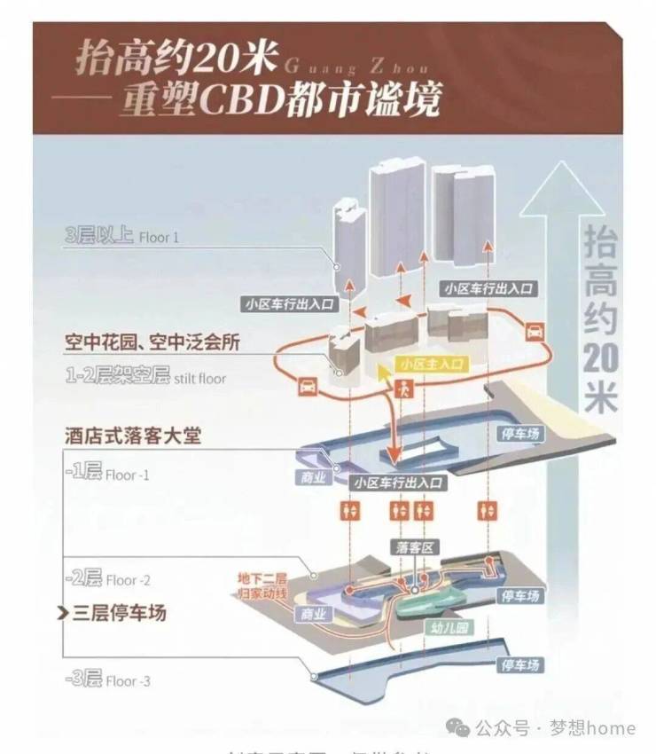 项目的体量比较小,小区的公建配套并不是很多。利用东西两侧天然高差,两度抬升,使项目整体抬高了约20米。然后,“立体拓展”:利用中间架空层,做出一座立体都市谧境。