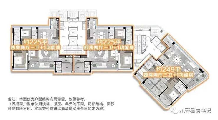 项目由两栋28层板式住宅组成,分为南北双塔,错落排布。1#南塔为261㎡户型,2#北塔为225-248㎡户型,总户数只有135户。