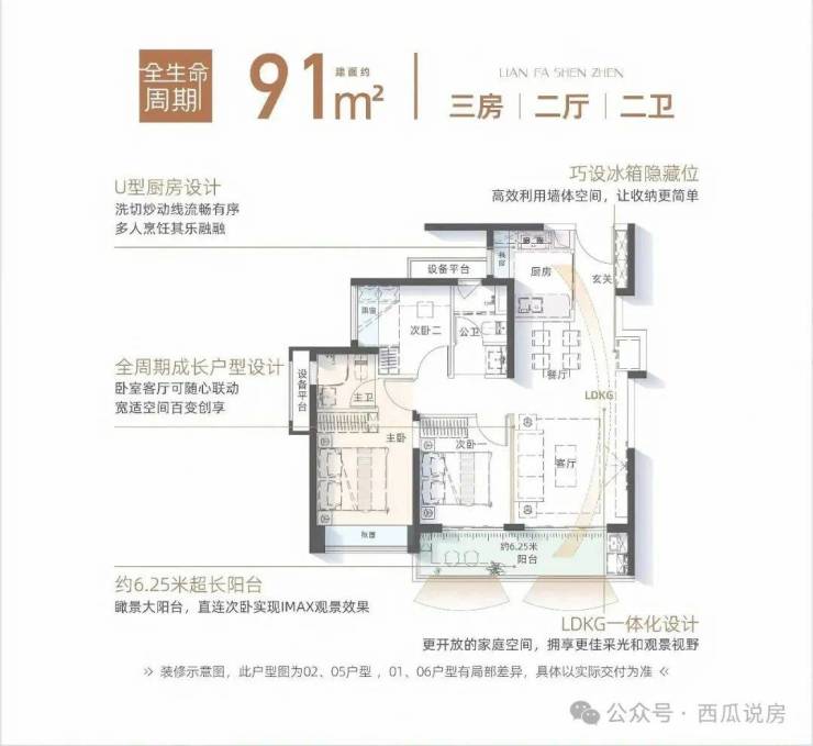 91㎡户型拥享约6.25米南向超长阳台,创变LDKG一体化设计,满足青年家庭成长需求。