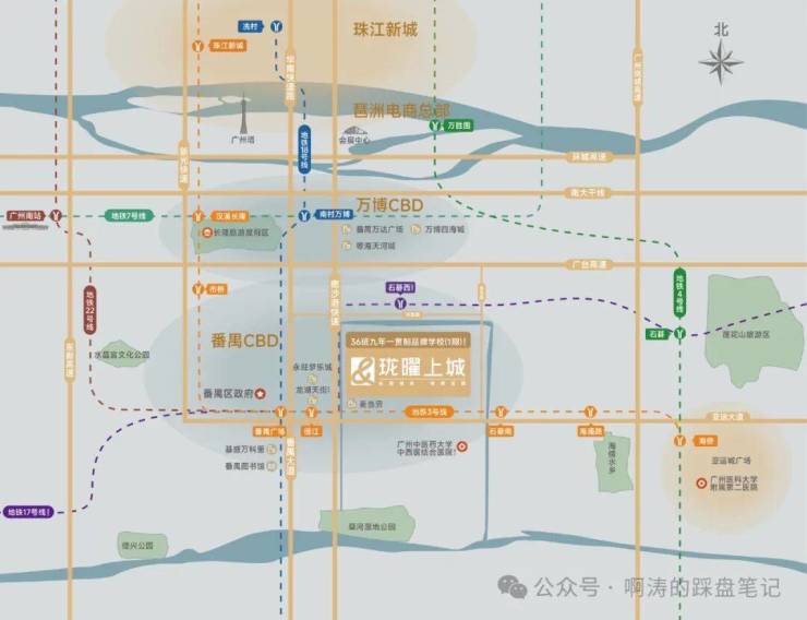雄踞南北格局:番禺发展已形成“北万博,南区府”双核心格局。万博区域以经济为支柱,区府兼具行政与生活服务核心功能。