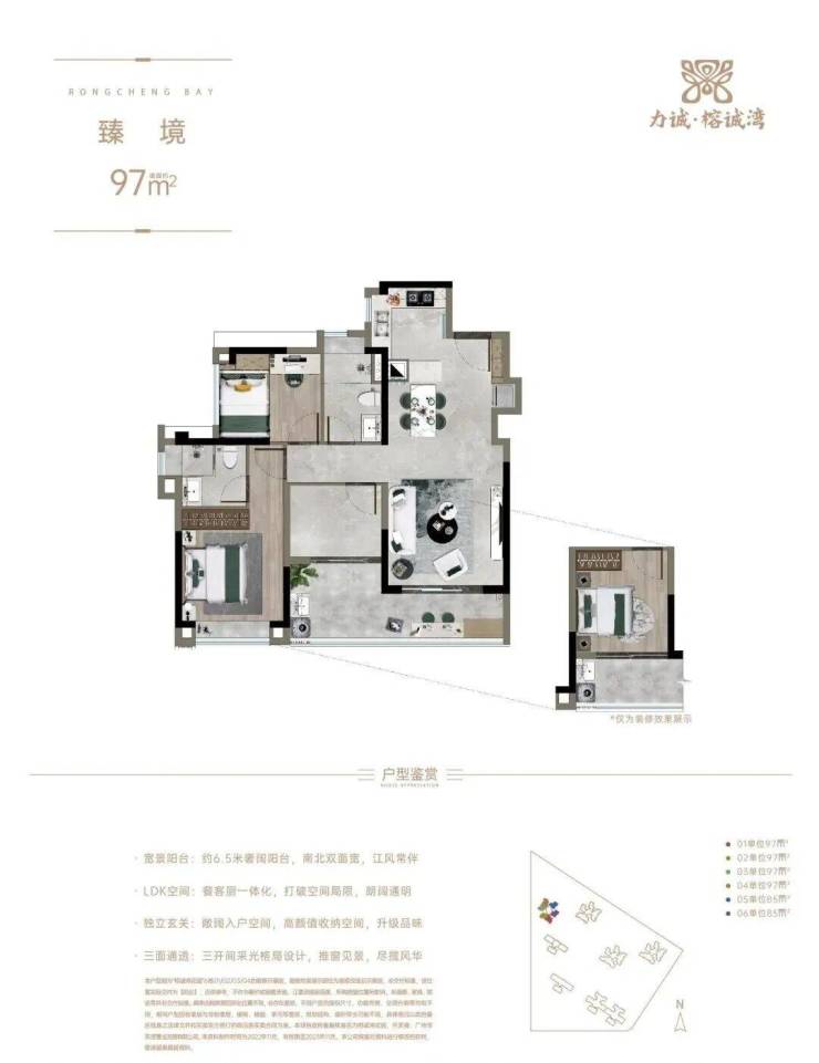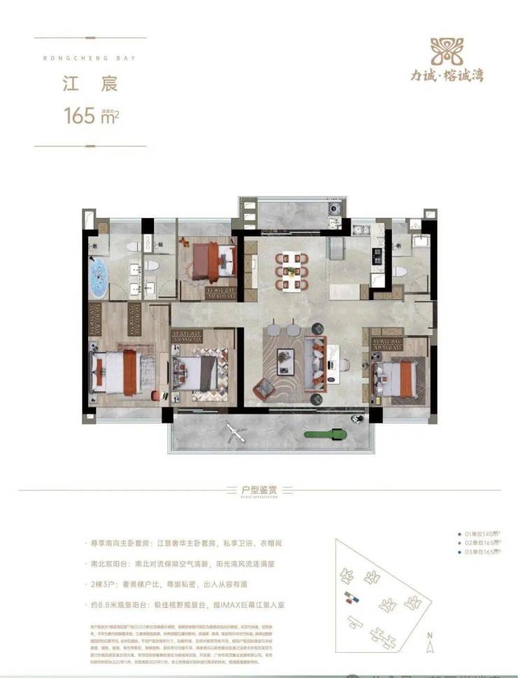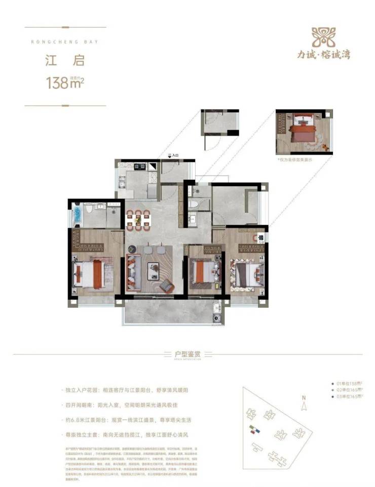 力诚·榕诚湾共有8栋住宅和1栋商业楼,主力面积段为85-165㎡江园二至四房,项目临江仅约30米,奢享一江双园艺境。