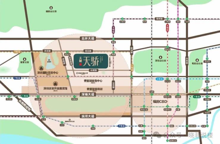 位处福田CBD、香蜜湖金融中心辐射区域,紧邻香蜜湖高端宜居豪宅区、香蜜湖金融街(建设中), 彰显独特的区位优势。