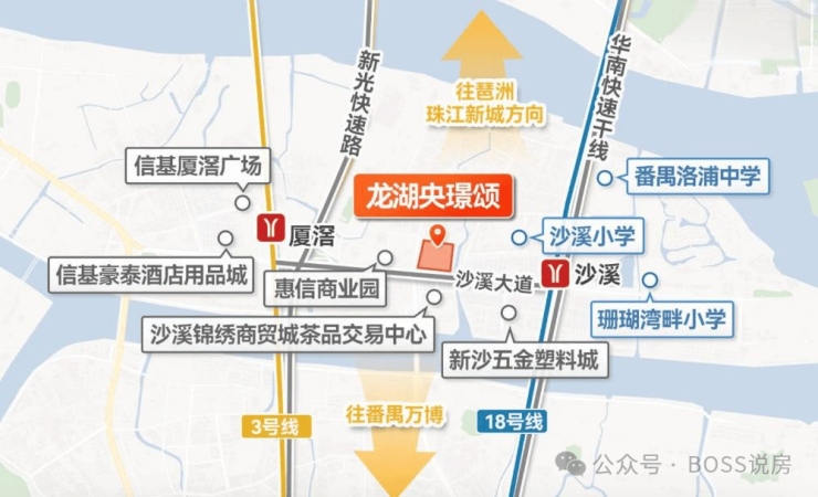 地铁:临近18 号线沙溪地铁站和3 号线厦滘地铁站,18 号线 1 站到万博,2 站到琶洲,3 站到珠江新城。