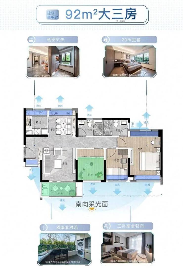 南北通透建面约92㎡大三房(2+1),东南向,单边位