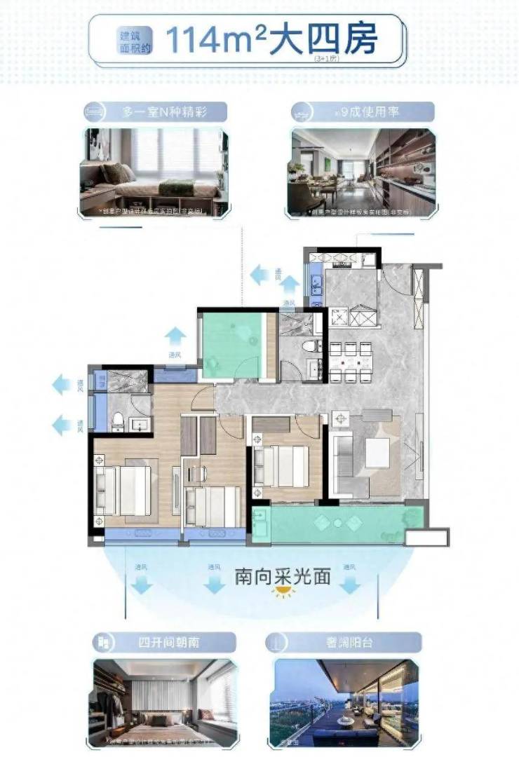 建面约114㎡大四房(3+1),精典竖厅,规划约6.5m长大阳台