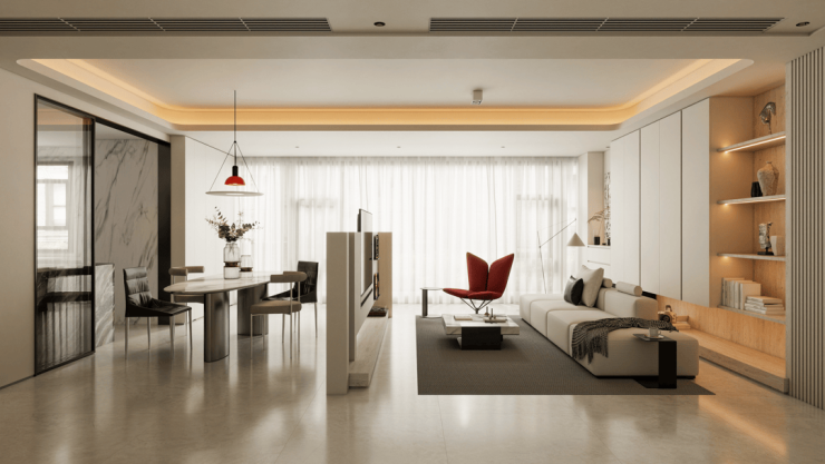 整个空间以纯粹的白色为基调,如同一张无限延展的画布。生活的琐碎被精心设计的收纳系统温柔“藏匿”,视觉所及之处,是留白带来的呼吸感与宁静。
