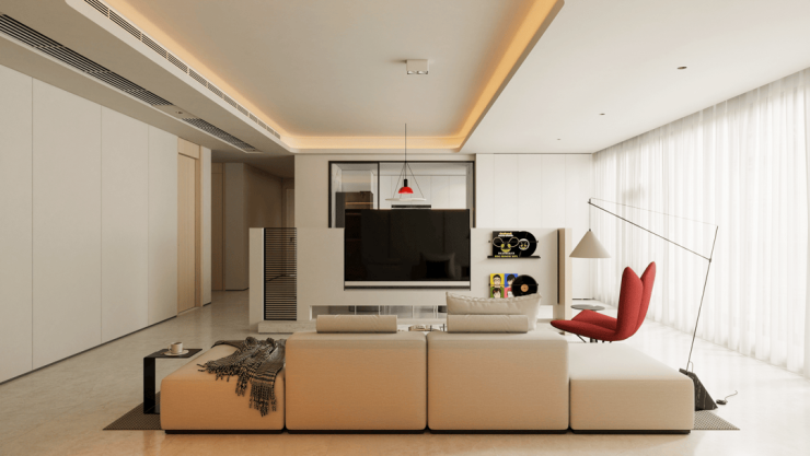 业主是一位深度宅家爱好者,沉浸于观影与游戏的乐趣中。因此,我们颠覆了以墙面为中心的布局,将一台可升降、360度旋转的电视置于客厅中央。它像一个自由的视觉灯塔,无论她窝在沙发里、在餐厨区准备餐食,还是在阳台边舒展身心,精彩的光影世界总能追随她的所在。空间,从此真正围绕人的动线而存在。