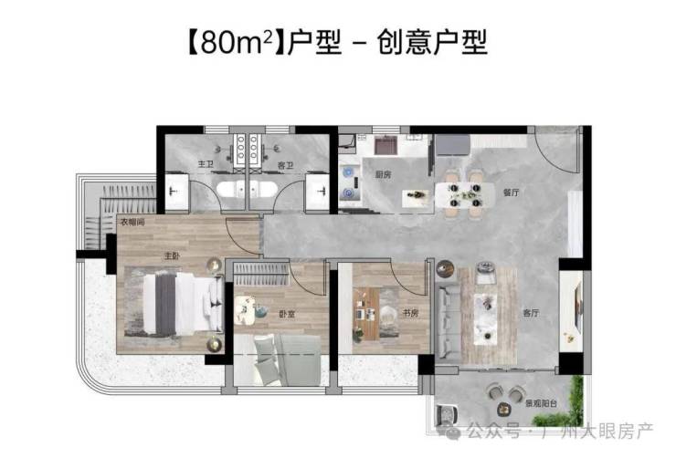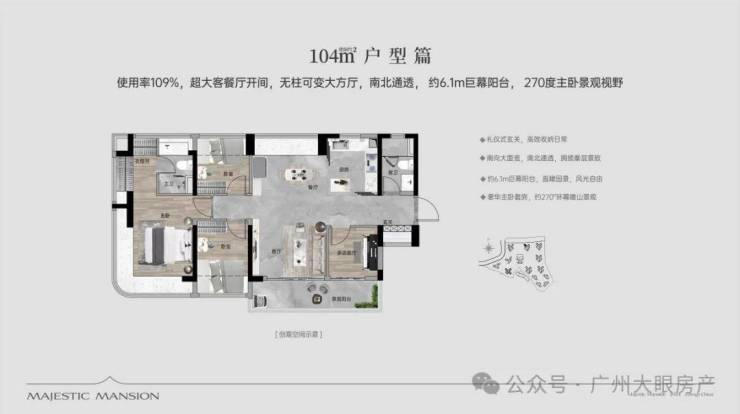 【80㎡三房2厅2卫】:东南向,使用率107%,四开间南向,12.6米超大面宽,主卧270°弧形玻璃幕窗。
