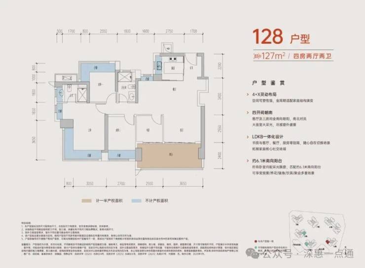 126-128㎡的4房2厅2卫,设计的是经典竖厅格局,进门入户玄关,客厅3.65米开间,LDKB一体化,S墙设计预留冰箱卡槽位,四开间朝南,动静分区,主卧+1个次卧270度大飘窗,客厅连接次卧出6.15米长大阳台,分别做到了主卧20.14㎡/次卧11.28㎡/次卧10.58㎡/次卧6.37㎡(包含墙体飘窗),U型厨房,卫生间干湿分离,得房率约:77.3-77.39%(不含赠送),东南朝向。赠送面积21.54㎡,加上赠送得房率94.45%。