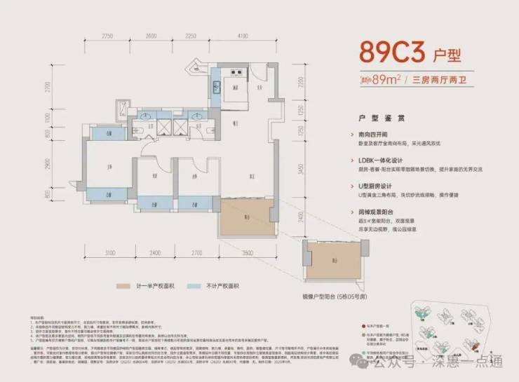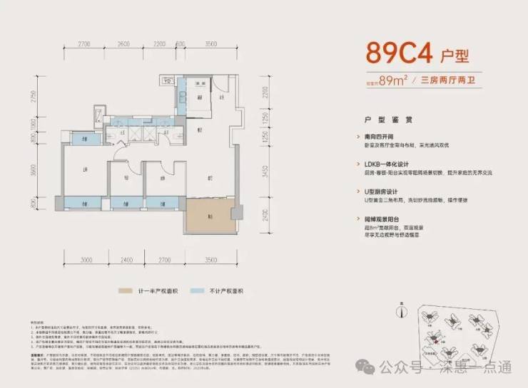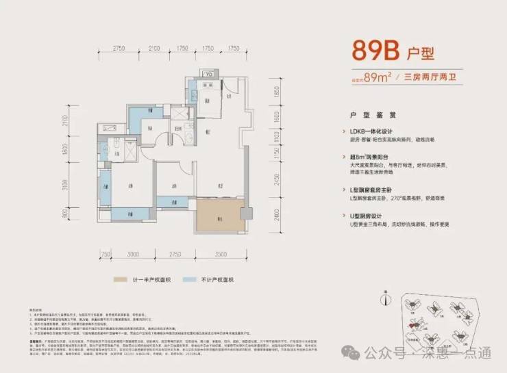 89㎡的3房2厅2卫,B户型,设计的是经典竖厅格局,进门入户玄关,客厅3.5米开间,LDKB一体化,动静分区,三开间朝南,S墙设计预留冰箱卡槽位,主卧+1个次卧270°飘窗,分别做到了主卧15.1㎡/次卧8.52㎡/次卧7.77㎡(包含墙体飘窗),U型厨房,卫生间干湿分离,得房率约:77.39%(不含赠送),西南朝向。赠送面积16.96㎡,加上赠送得房率96.84%。