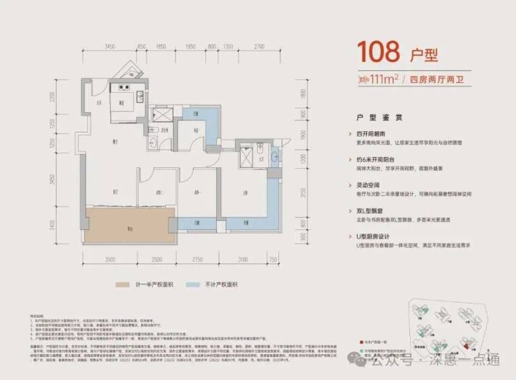108-110㎡的4房2厅2卫,A户型,设计的是经典竖厅格局,进门入户玄关,客厅3.45米开间,LDKB一体化,S墙设计预留冰箱卡槽位,四开间朝南,动静分区,主卧+1个次卧270度大飘窗,客厅连接次卧出6米长大阳台,分别做到了主卧16.4㎡/次卧11.2㎡/次卧7.84㎡/次卧6.25㎡(包含墙体飘窗),U型厨房,卫生间干湿分离,得房率约:77.3-77.39%(不含赠送),西南朝向。赠送面积18.4㎡,加上赠送得房率94.04%。