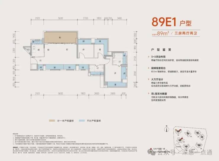 89㎡的3房2厅2卫,E1户型,设计的是横厅南北通透格局,进门入户玄关,客餐厅5.6米开间,LDKB一体化设计,客餐厅出11㎡的大阳台,主卧+1个次卧双飘窗设计,全屋12面飘窗,分别做到了主卧15.1㎡/次卧7.83㎡/次卧6.96㎡(包含墙体飘窗),L型灵动式厨房,卫生间干湿分离,得房率约:77.39%(不含赠送),阳台主朝西北向。也是可以改4房的格局,赠送面积24㎡,加上赠送得房率104.44%。