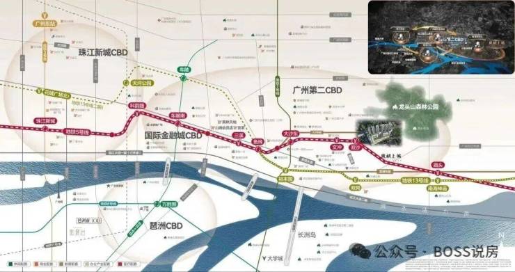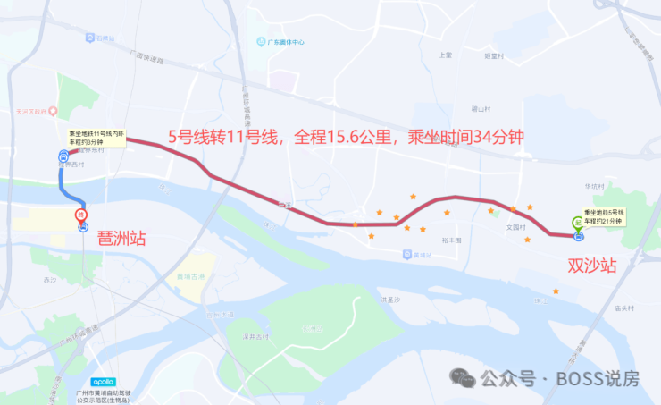 地铁:项目为地铁 5 号线双沙站上盖,可一线直达珠江新城、金融城等核心区域,且邻近地铁 13 号线、25 号线(规划中),沿线可换乘多条线路,去往珠江新城约34分钟,琶洲约34分钟,大学城南32分钟,万博约44分钟