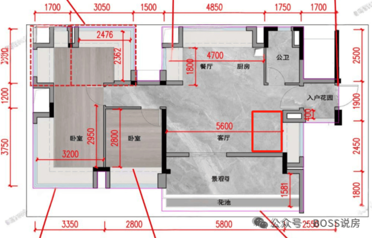 超大LDKB方厅:客餐厨阳台四大功能区打通。一键切换聚餐、party模式