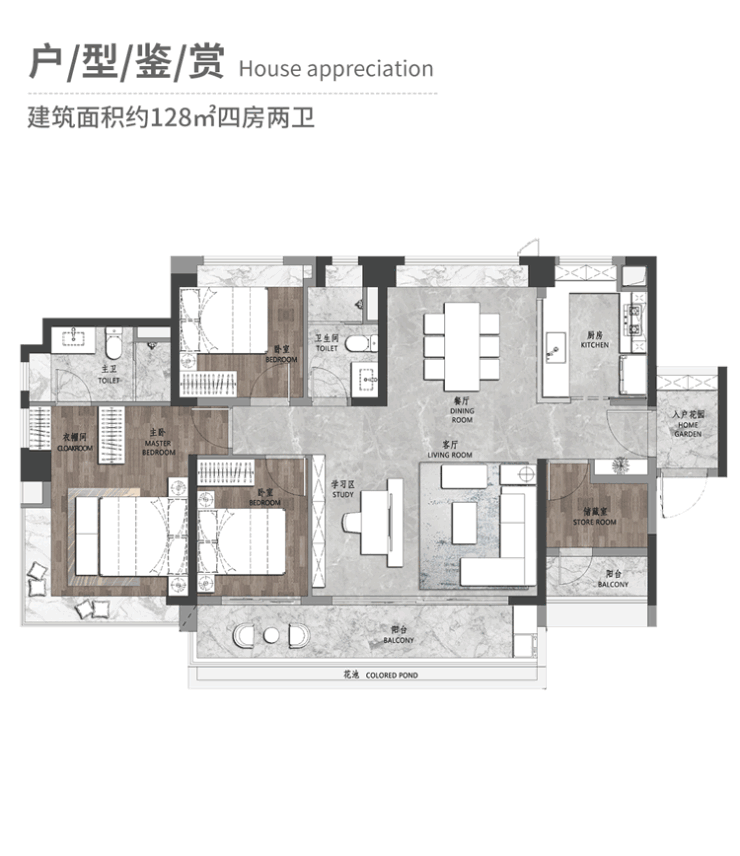 建面约128平四房,尺度堪比市面上约144平产品。