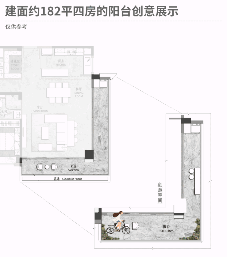 第一点,很多项目在提升阳台尺度时,都是一字型拉开长度,但朗阅建面约182平单位,直接做了L型超长转角阳台,足足约16米长!