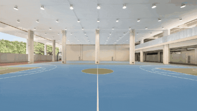 高大的教学楼、宽敞的体育场,且抬高的运动场底部,设置下沉式篮球场、兴趣大道、游泳馆、科技馆、艺术厅等场馆。