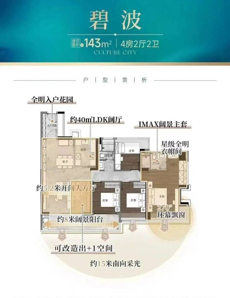 建面约128㎡的四房,则做到约16米南向采光、南北对流,且拥有一个约40㎡LDK阔厅,碾压市场同面积产品。