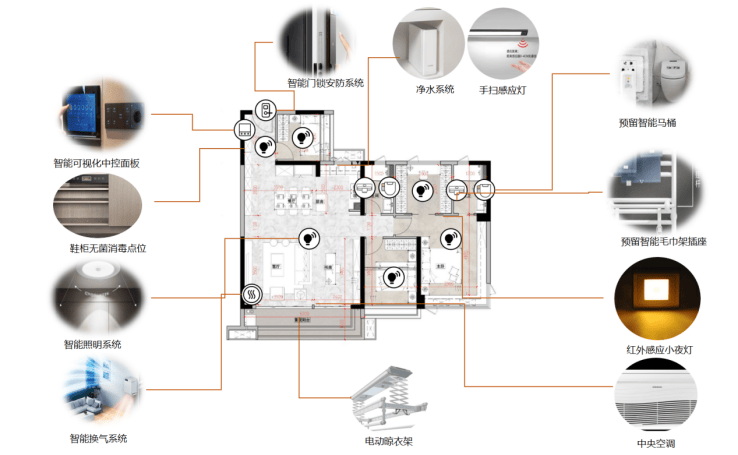 作为广州市第三个与华为合作的项目,项目交标标配华为鸿蒙智能家居系统+全屋新风系统,中控屏一键调控不同场景模式下所需的室内湿度、温度及室内灯光条件,在住宅生活方面采用智能马桶、净水系统、红外感应小夜灯、电动晾衣架等,配备全屋新风系统,为居者提供24h洁净居家环境。