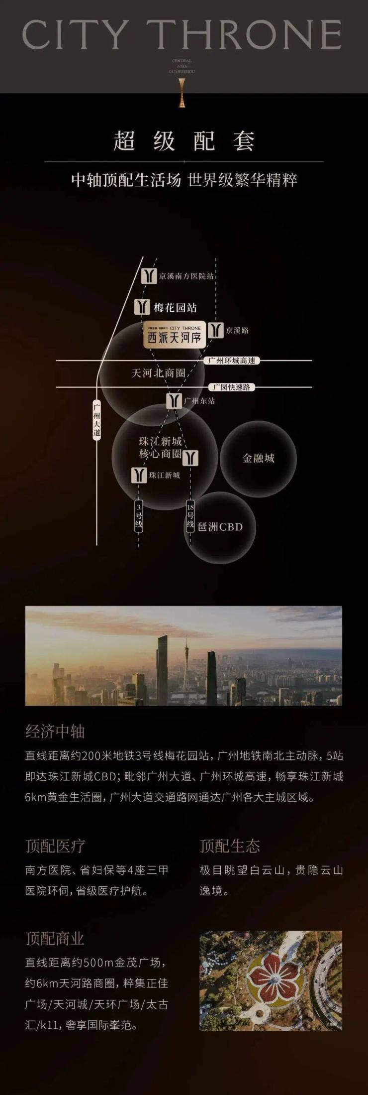 地段定鼎价值,通达赋能生活,西派天河序的区位优势天赋异禀。项目坐落于天河梅花园核心板块,雄踞广州新中轴之上,西接珠江新城、北承白云山生态带,30分钟内可通达金融城、智慧城等产业核心区,坐享三大核心板块发展红利,是天河核心区稀缺的纯改善低密住区。交通方面,项目构建“双地铁+主干道”立体交通网络,距离地铁3号线北延段梅花园站仅约400米,步行5分钟即可抵达,5站直达珠江新城,无需换乘,通勤高效便捷;在建中的18号线北延段京溪路站近在咫尺,未来开通后将进一步提升出行效率,直达琶洲、广州南站等核心节点。自驾方面,周边广州大道北、环城高速等主干道环绕,20分钟可畅达中心六区,真正实现“快进慢出”的舒适生活节奏。