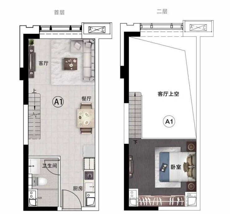 2. 百变loft产品 | 49.72㎡一室二厅一卫4.5米层高 挑空客厅 舒适度已然拉满餐客厨一体化设计 放大生活质感整层卧室设计 奢享私密上下之间 尽拥时光百变