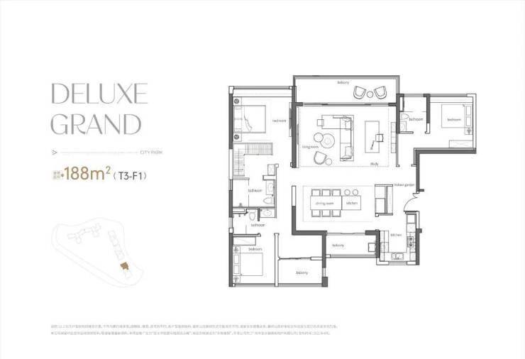 190方户型,四房两厅三卫双套房,T2组合、7米大阳台、9米阔卓厅堂、近55方餐厅,诠释了功能与奢适完美相融