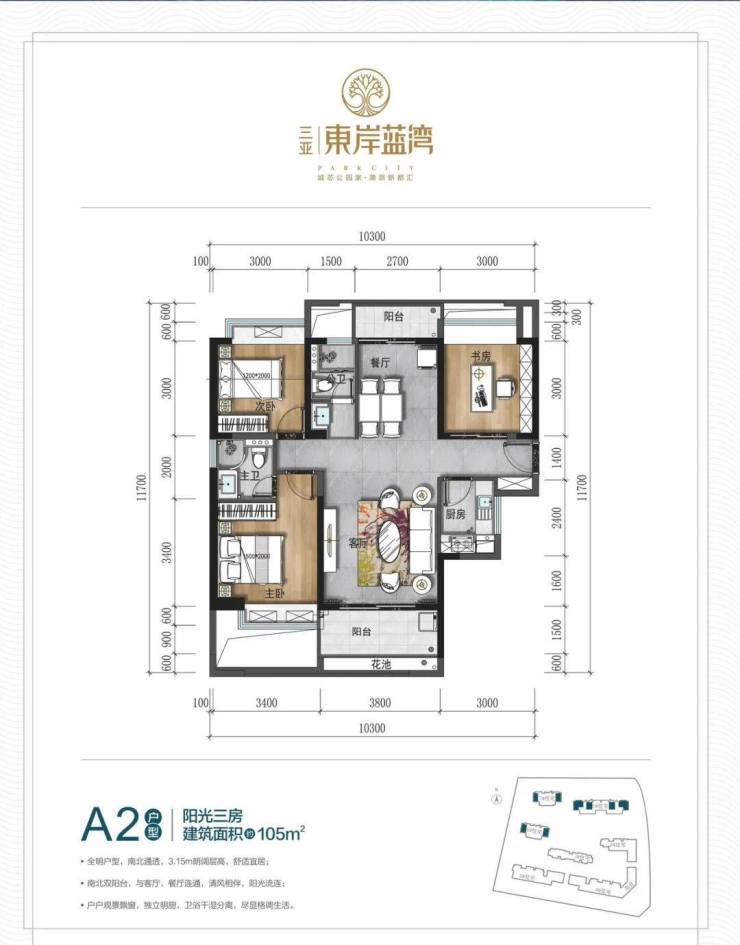 项目基本信息开发商:海南和鑫地产开发有限公司地址:三亚市总部经济及中央商务启动区东岸单元总占地:约31000㎡总建面:约110000㎡产品:住宅102-143㎡三至四房,16-144㎡临街旺铺总户数:住宅702户,商铺31户车位数:850个(地上:146个,地下:704个)层数:22-24层住宅梯户:两梯两户、两梯四户住宅户型:102-105㎡|3房2厅2卫124㎡|3+1房2厅2卫143㎡|4房2厅2卫产权:住宅70年,商铺40年容积率:2.5绿化率:约40%交付标准:住宅精装交付,商铺毛坯