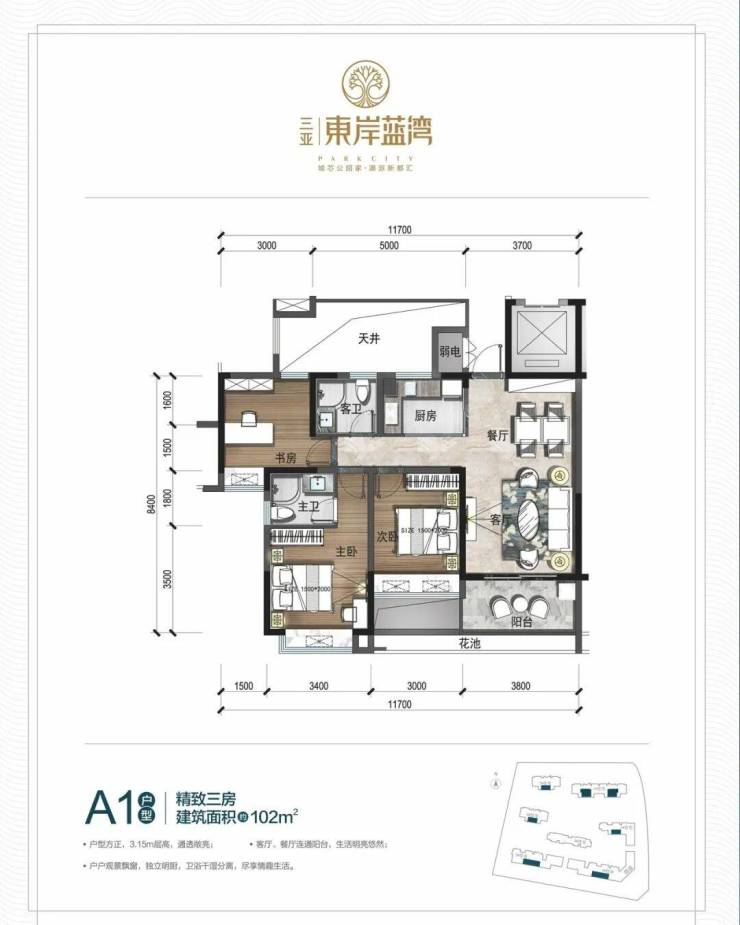 板式结构,南北通透,通风采光极佳▼A1户型: 102㎡ 精致三房