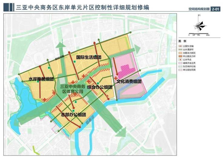 三亚中央商务区东岸单元——商业商务、文旅消费、居住生活综合服务功能• 一芯:以三亚中央公园为城市绿芯• 四廊:延续现有水绿脉络,打通区域十字山海绿廊,串联城市区域板块• 多组团:总部办公组团、综合办公组团、文化旅游组团、国际生活组团和水岸雅居组团