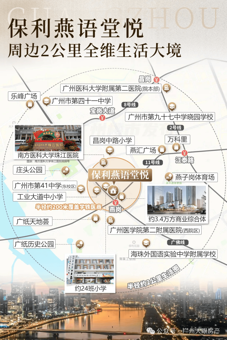 项目位于海珠区工业大道中的燕岗地铁站旁,地铁上盖项目(在建中的11号线+广佛线),坐落于工业大道中,背靠珠江后航道,傲立于海珠新活力文商旅融合圈与广州市"首个"后航道服务型制造创新带交汇的核心地带,海珠后航道将成为海珠未来唯一连片开发的豪宅板块。