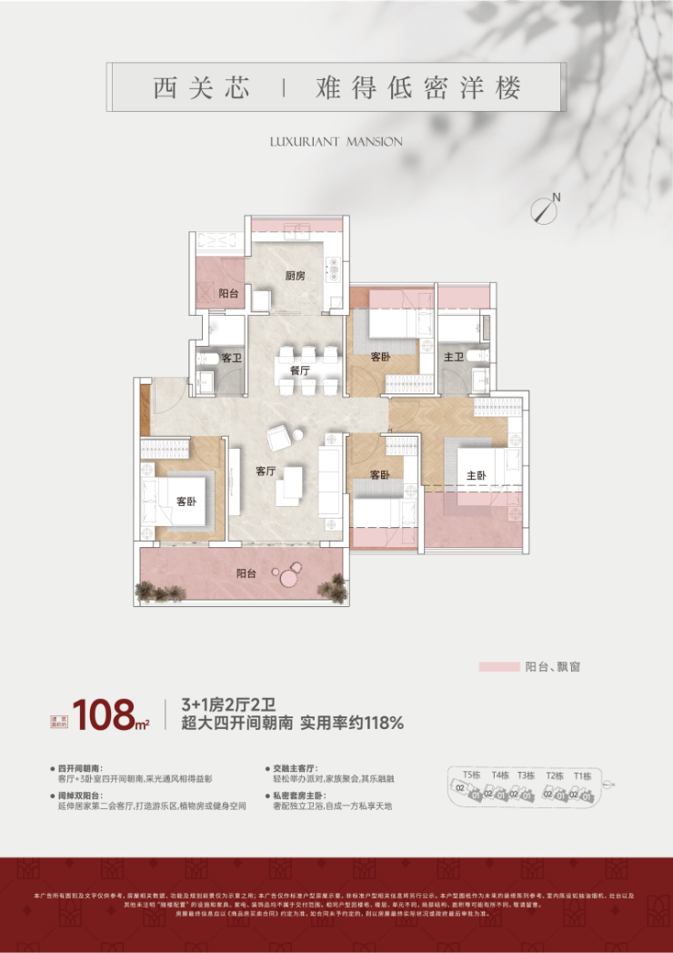 主力户型约108平四房,做到了四开间朝南,其中三间卧室都是南向。这当中,主卧套房独占东南侧单边位,通风和采光都明显占优。