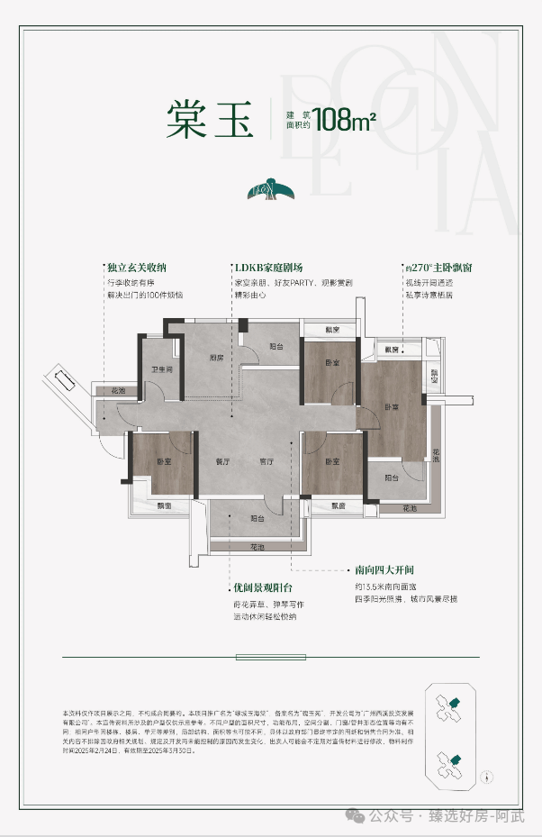 建面约108㎡ 4空间2厅2卫,项目放在了东南单边位,而且是南北对流设计,保证了采光通风,在市场同面积段产品里比较少见,所有房间都有花池、飘窗赠送,空间感应该不小,像主卧还能放下衣帽间,估计整个户型实际能去到120㎡左右,进门处带了入户花园,可以用来收纳之余,也多了一份仪式感,总价400万起。