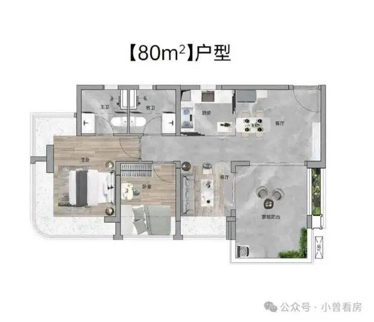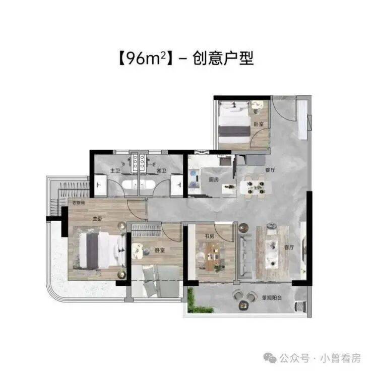 96㎡户型货量最多,相当于 80㎡的升级版,入户多了一个卧室,阳台长达 5.7 米,景观视野更开阔。