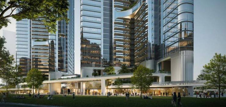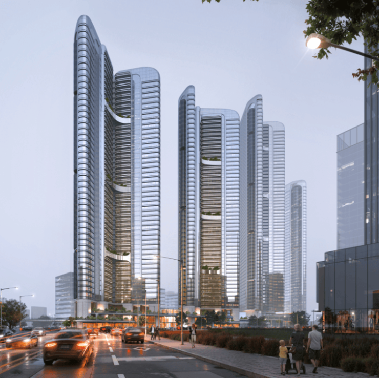首期规划两栋超高层商业塔楼,分别为 50 层、建筑高度 210.3 米,及 48 层、建筑高度 202.5 米,临江再配建两栋低密总部办公建筑,构筑层次分明的滨江天际线。