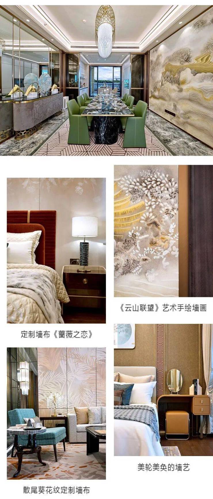 此外,星河湾精选现代堆积浮雕工艺定制艺术手绘墙画、麂皮绒精雕复合烫金工艺订制墙画,3D精雕工艺+AI单色刺绣定制扪皮等,将一个个典雅而又华丽的艺术,绘制在墙上。星河湾的半岛五號,非但是品质的人居,亦是艺术的藏馆。