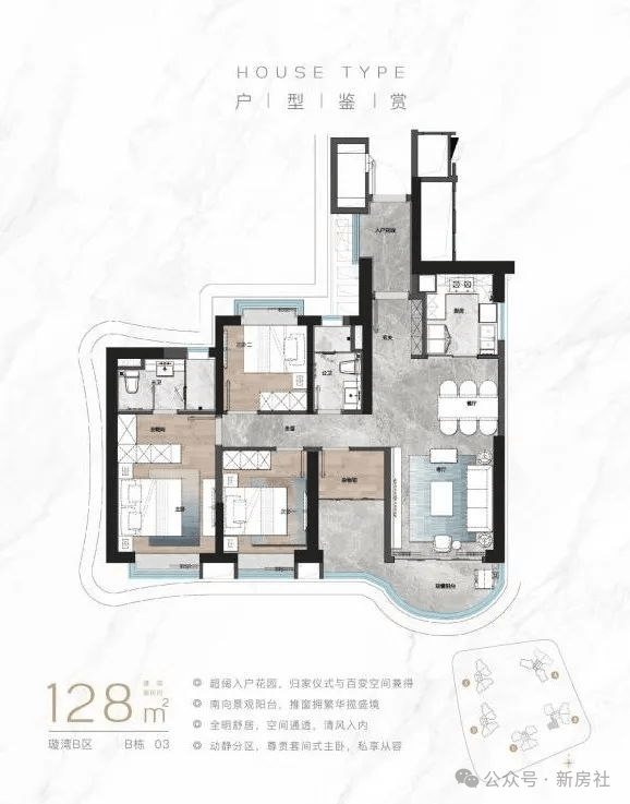 八重酒店式归家礼序,选用博物馆级环球石材,打造酒店式社区落客区;社区迎宾大堂(层高约9米);四季风雨连廊;单元豪华大堂;超配车库入口;车库地下豪华大堂;精装车马厅;臻享高定生活入户礼遇,塔尖圈层生活境界。