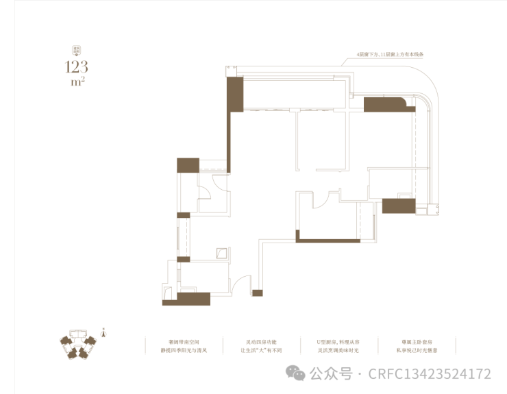 4~11层低区住宅:两梯八户,面积107-123㎡三至四房