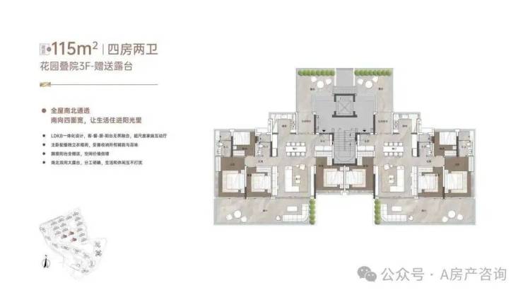 “玥境”为滨江小叠院,主打112-130㎡低密叠院,最大亮点是超高赠送率,1F、2F户型赠送私属花园,3F赠送超大景观露台,4F复式设计,赠送顶层天台。