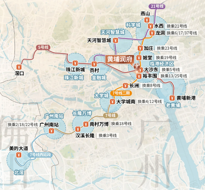 黄埔润府坐拥广州超级换乘站(大沙东站),广州地铁5号线和7号线,承载广州城市发展战略以及粤港澳大湾区城市之间协同发展的重要意义。5/7号线双地铁,直达广州东西、南北各大CBD和产业新城,零距离串联广州纵横要位,交通极其便捷。5号线直达金融城、珠江新城;7号线3站即达科学城,8站到长隆万博。