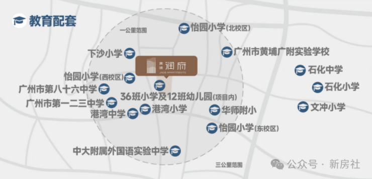 黄埔润府除了社区配建36班小学(签约怡园小学)及12班幼儿园,实现目送式步行上学之外,周边还聚焦了片区多所优质学校,怡园小学、下沙小学、港湾小学,以及广大附中黄埔实验学校、广州市八十六中学等。