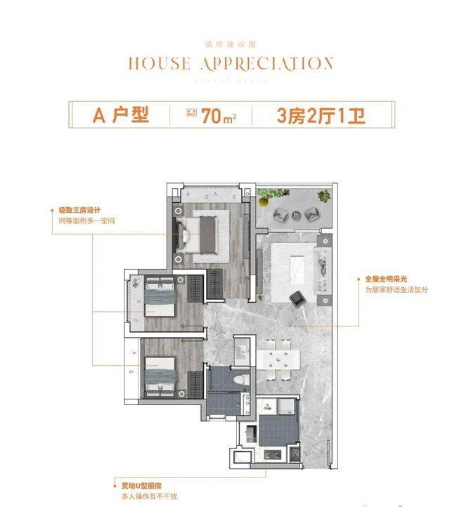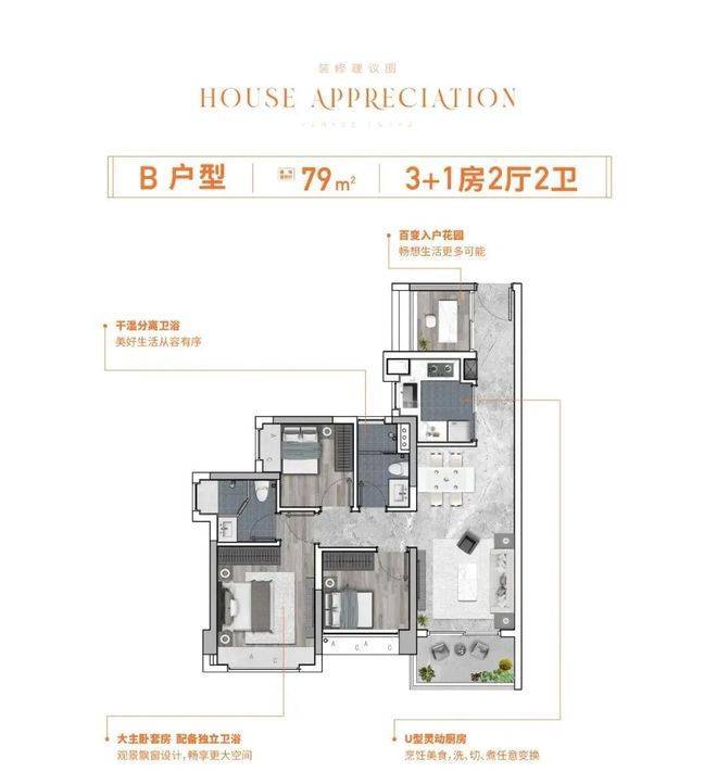 在产品设计上,珠实·云悦花语充分体现了“以人为本”的理念。项目建筑面积涵盖约70-98㎡的3至4房户型,布局科学合理,满足不同家庭的多样化需求。约70㎡的小三房,空间利用率近九成,是片区内面积最小却功能最全的三房户型,实现了“小面积,大享受”的居住理念。户型设计考虑到全屋全明采光、干湿分离以及餐客厅阳台一体化,让居住者在有限空间内享受开阔舒适的居住体验,充分兼顾了实用性与生活品质。