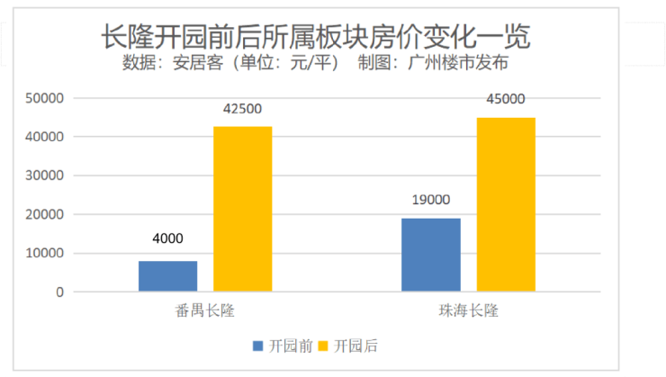 珠海长隆所在的横琴,2014年长隆开业前整体均价才2万元/㎡不到,长隆开业后,不到2年的时间,周边房价已翻倍,目前普遍在4-5万/㎡。