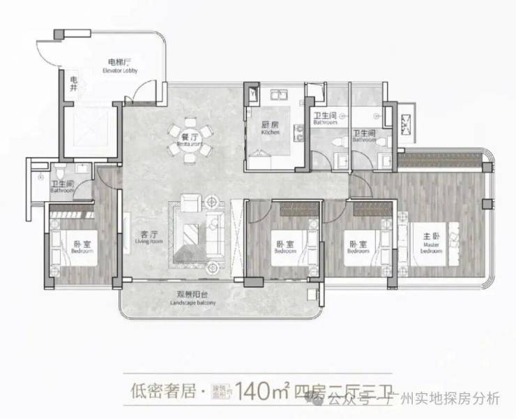【阅境】建面约140㎡四房三卫,客厅开间达到了5米,约8.3米长的南向大阳台,五开间朝南。