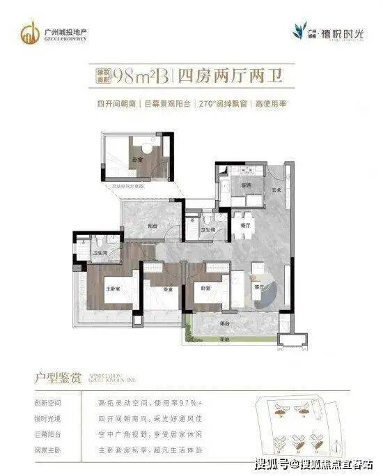 全屋超实用大开间设计,打造四开间朝南+奢阔景观阳台+大尺度飘窗+高拓展空间,让生活大有“享”法,户户主卧带270°巨幕飘窗,日常起居尊享超广角风光。