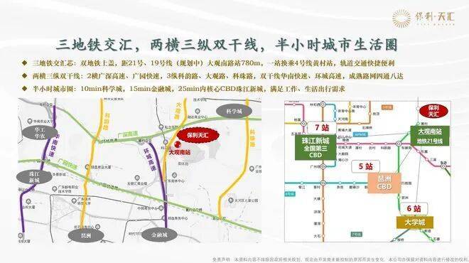 地铁方面,项目距离地铁21号线大观南路站约1.2公里,步行约20分钟,可1站换乘4号线,直达金融城、琶洲,4站到员村换乘5号线,快速接驳珠江新城。自驾方面,周边有广深高速、广园快速、大观路、机场第二高速(在建),可在40分钟内通达广州各核心城区,尤其是前往金融城、珠江新城、琶洲等地,通勤便利度高。