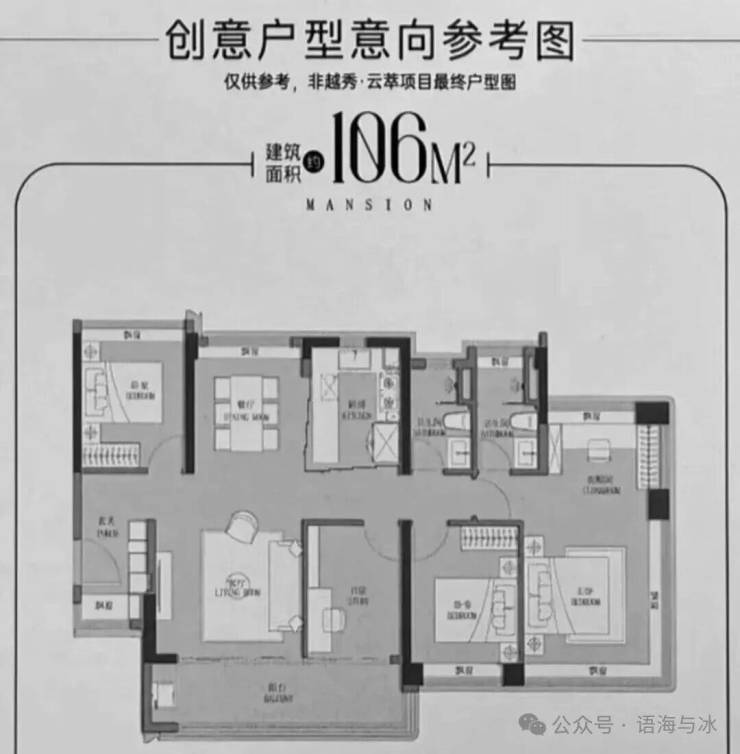 建面106平四房两卫,跟云悦105平也一样,从图纸上看,看不出飘窗有什么改动,不过这一次户型最大亮点,就是看最终飘窗能不能打掉。